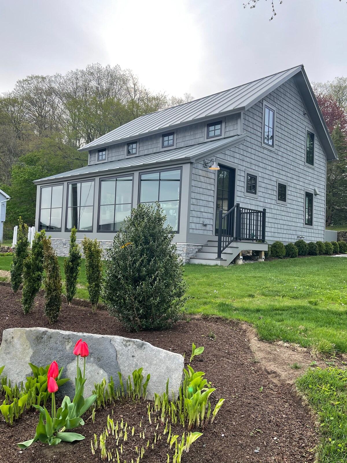 Élvezd ezt a bélelt, felújított, kétszintes, strand utáni luxuskunyhót Kent, CT mellett. Mindössze 9 percre Kent belvárosától és Litchfield megye legjobbjainak közelében található házunk egy nyugodt, 3,5 hektáros ingatlanon fekszik, amely védett erdőségekig terjed. Gondosan hoztuk a rusztikus helyet a jelenbe, egy új teakonyhával, masszív, gyógyfürdőszerű zuhanyzóval ellátott fürdőszobával, új HVAC-nal és szállodaszerű szállásokkal. Közel a Kent Schoolhoz, Canterburyhez, és nagyszerű egy romantikus kiruccanáshoz.