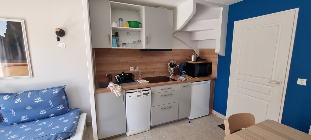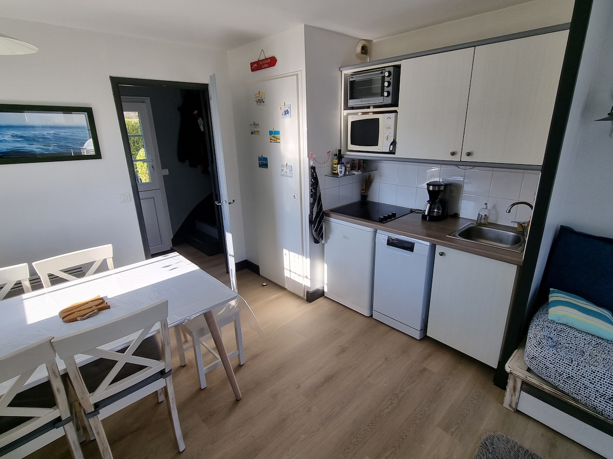 Petit logement indépendant pour 2 personnes , salle de bain avec toilette , lit en mezzanine, échelle escamotable, être suffisamment agile pour monter à l'échelle! coin cuisine, réfrigérateur, cafetière ,bouilloire, grille pain, jardin privatif pour manger dehors, cuisine extérieure avec micro-ondes, barbecue, chaises longues a 300 m de la côte sauvage et du chemin de randonnée Idéal pour la pêche et la chasse sous marine
