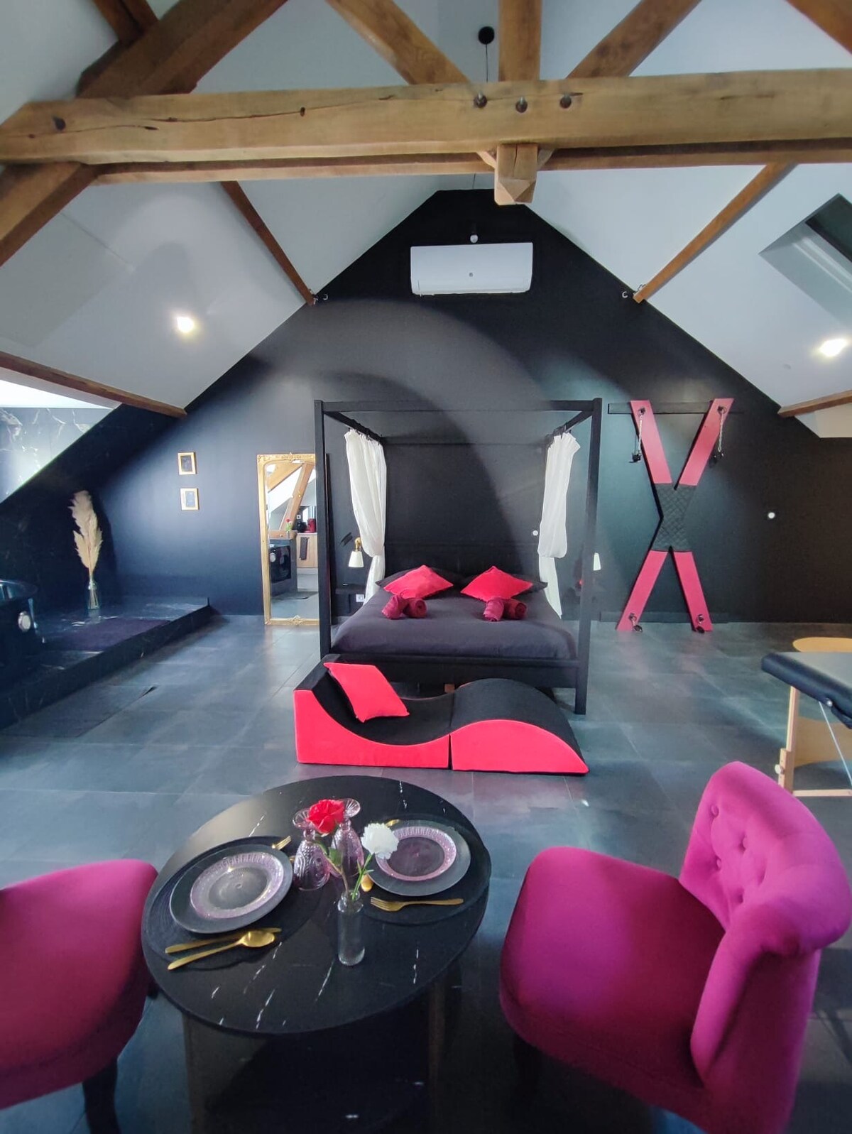 Ez a romantikus loftlakás kellemes és stílusos kiruccanást biztosít. Kifinomult dekorációnak és hangulatvilágításnak köszönhetően azonnal a kényelem és a melegség gubójában érezheted magad. A tökéletes kikapcsolódás érdekében élvezd a masszázsasztalt és a balneo fürdőkádat Szeretnél új távlatokat felfedezni a partnereddel? A St André kereszt, a tantra karosszék és a hinta azért van, hogy feldobja a szálláshelyen eltöltött idődet, és szabadon engedje a képzeletedet.
