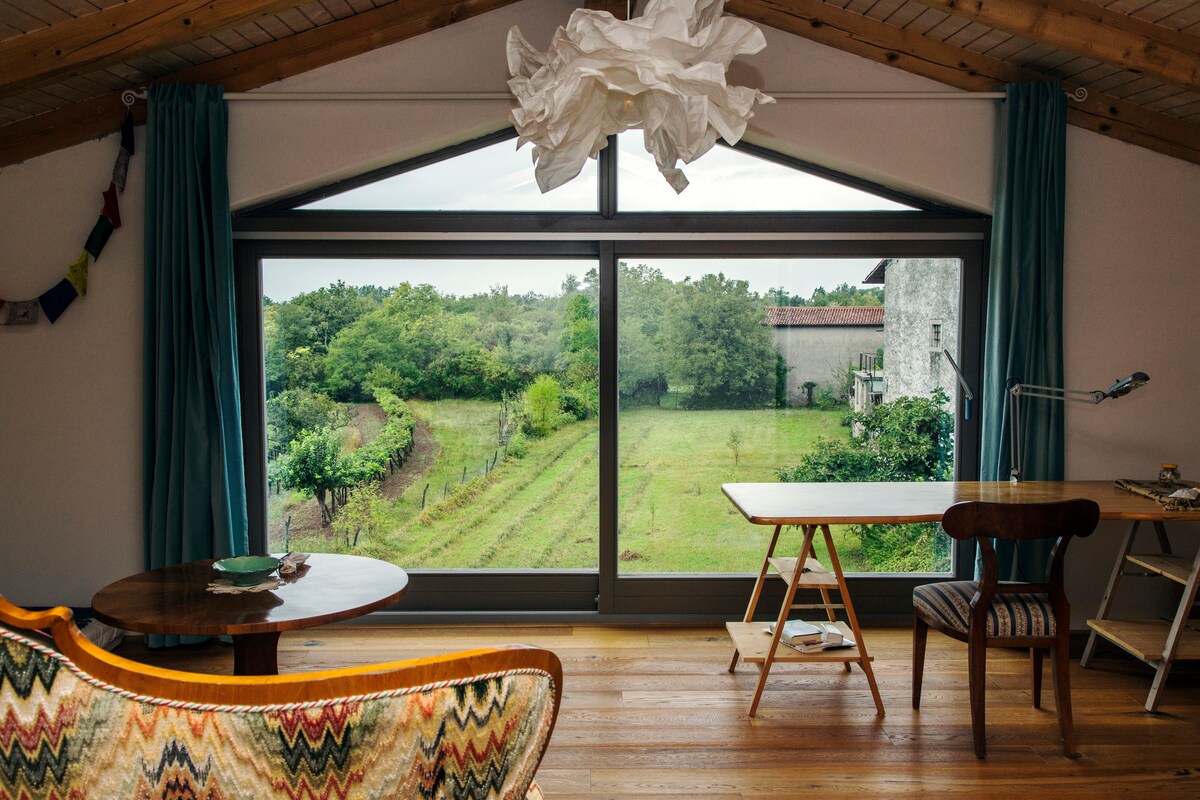 A lakás egy csendes faluban található, természetes környezetben, közvetlenül az olasz határnál. A vendégek egy festői félórás sétával eljuthatnak a közeli dombra, ahonnan lenyűgöző kilátás nyílik a tengerre és az Alpokra. A híres Goriška Brda borvidék csak pár percre van, ahol kiváló borászatok, borkóstolók, éttermek és hagyományos tavernák várnak. Népszerű látnivalók a lipicai lovak, a Postojnai-barlang, és a kiváló határmenti elhelyezkedésnek köszönhetően a Velencébe, Triesztbe és Udinéba tett egynapos kirándulások is.