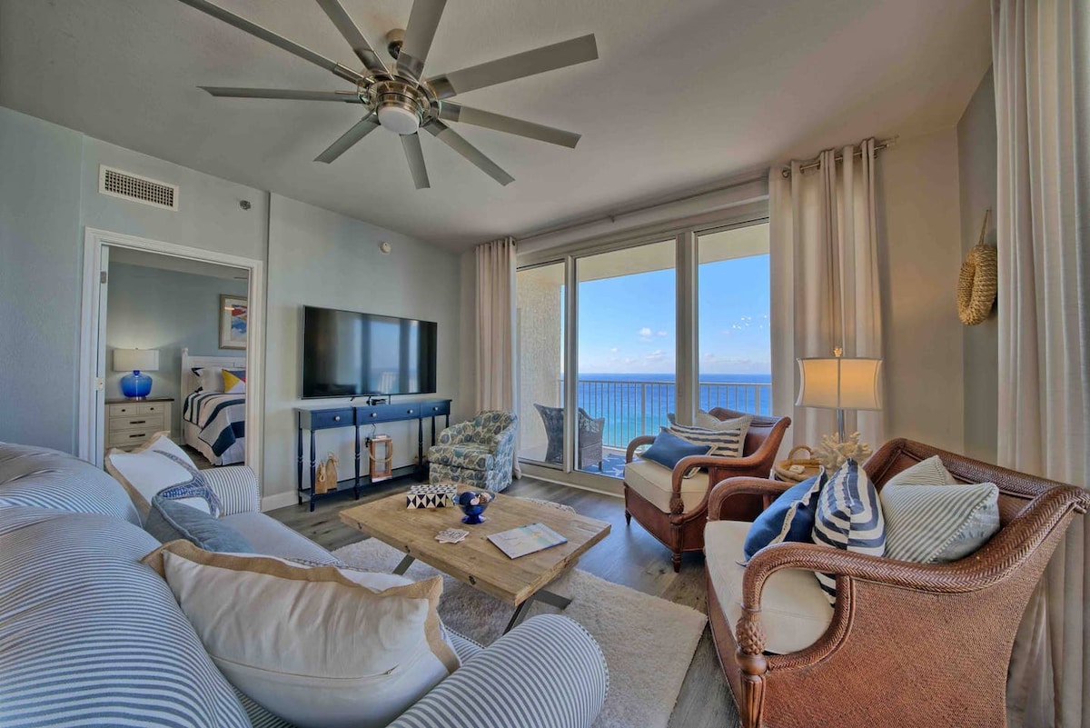 This GULF FRONT BEACH condo has a style all its own. Long Beach is a gated community and features the longest stretch of sand in PCB. This newly renovated condominium on the 7th floor has panoramic views of the Gulf from every room . Spanish-style ceramic tile floors & premium granite countertops throughout. The huge curved balcony attracts spectacular sunsets. The resort has low occupancy so the super-fast elevators won't leave you waiting. The resort has a 25 yo age minimum in order to book.