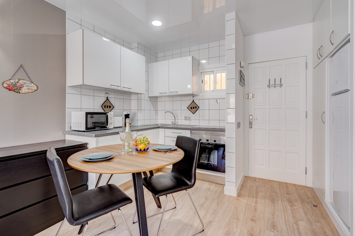 Wake up in our bright and stylish studio, just 2 min to Los Cristianos beach. It offers a sunny private balcony, comfy memory foam bed, fast WiFi, and a fully equipped kitchen. Ideal for couples, solo travelers, or remote workers, the studio combines comfort and functionality. Enjoy breakfast on the balcony, relax after a beach day, or work remotely in a peaceful environment. The location puts you steps away from shops, cafés, restaurants, and the lively atmosphere of Los Cristianos.