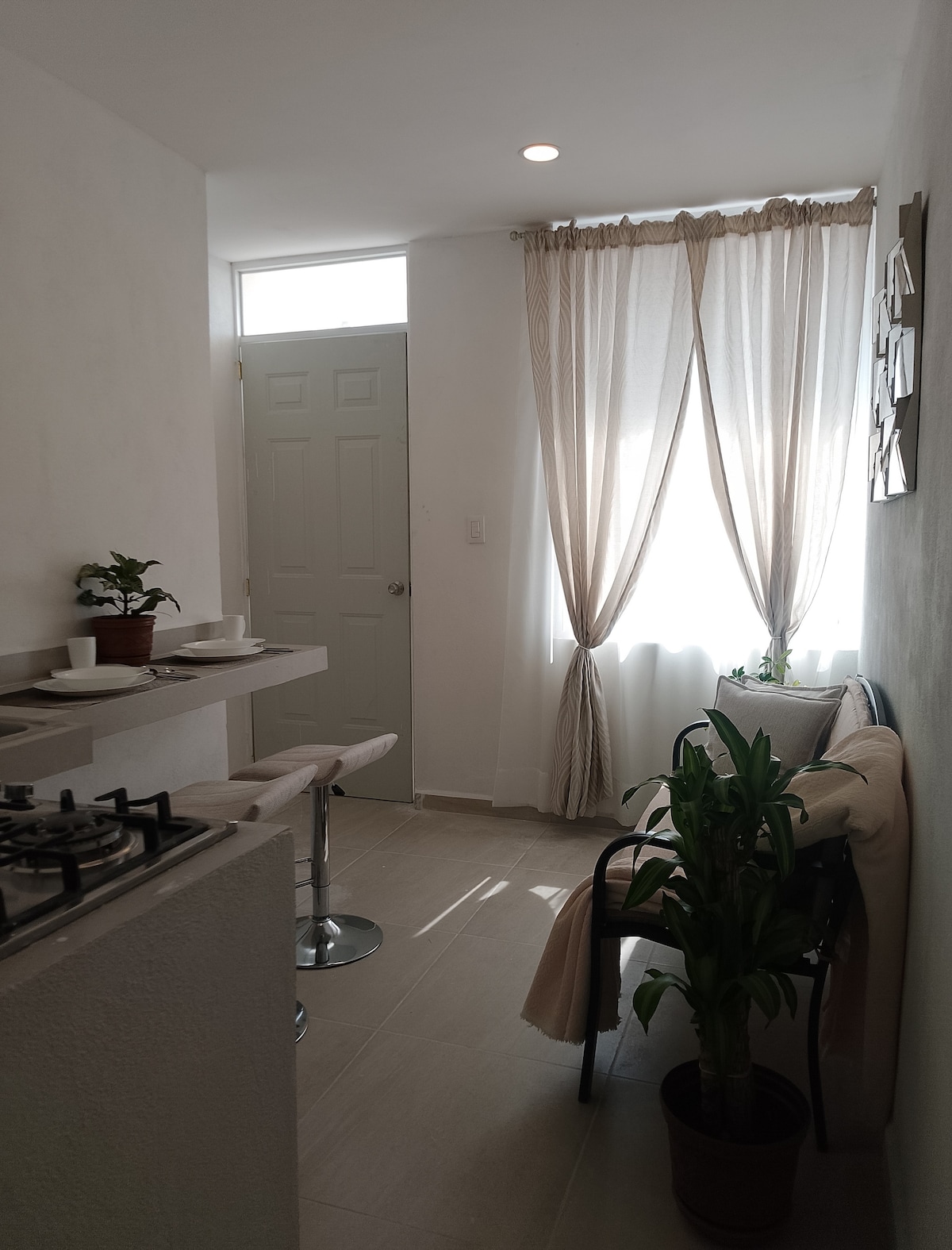 Departamento completo ideal para disfrutar tu estancia en Qro. Habitación muy amplia, cuenta con mini split, TV, clóset, 2 silloncitos y espejo de cuerpo completo. La cocina está equipada con: parrilla eléctrica, microondas, licuadora, cafetera, refrigerador, vajilla para 4 personas, y accesorios básicos para uso de la cocina. 1 baño completo (se utilizan paneles solares para el agua caliente), incluye: jabón para manos, shampoo, jabón corporal, toallas, secadora p/cabello y plancha p/ropa