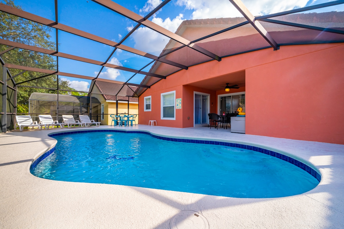 A családod imádni fogja ezt a tágas, egyszintes villát árnyékolt, privát és fűtött kültéri medencével. 4 hálószoba, 3 teljes fürdőszoba és 2 nappali kényelmesen elfér több családnak. A 2023-as frissítések közé tartoznak a következők: minden új bútorzat, konyhai eszköz, matrac, ágynemű, fürdőszoba és még sok minden más. Kevesebb mint 20 percre az összes Disney vidámparktól és 5 percre a ChampionsGate-től. Rengeteg helyi vásárlási és étkezési lehetőség van a közelben. Tökéletes kiruccanás egy varázslatos és emlékezetes családi nyaraláshoz!