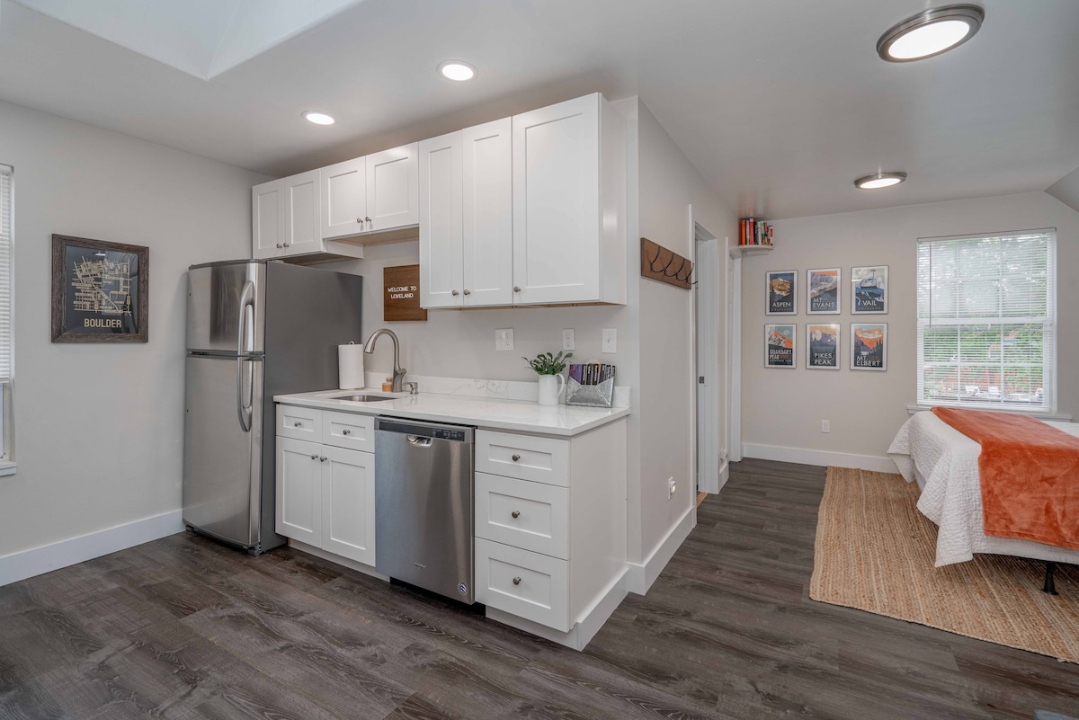Relax in this stylish studio - so much more comfortable than a stale hotel room! Boasting a well-equipped kitchenette with convection micro, 2 burner stovetop, sink, dishwasher, and fridge, you can eat in if you chose. The zero-entry rain shower is fantastic. Washer/dryer, cotton linens, down comforter/pillows, & a smart TV. This cozy nest is perfect for a comfy evening watching your favorite show. Less than a mile from oldtown Loveland, where you'll find lots to eat, drink, and do!