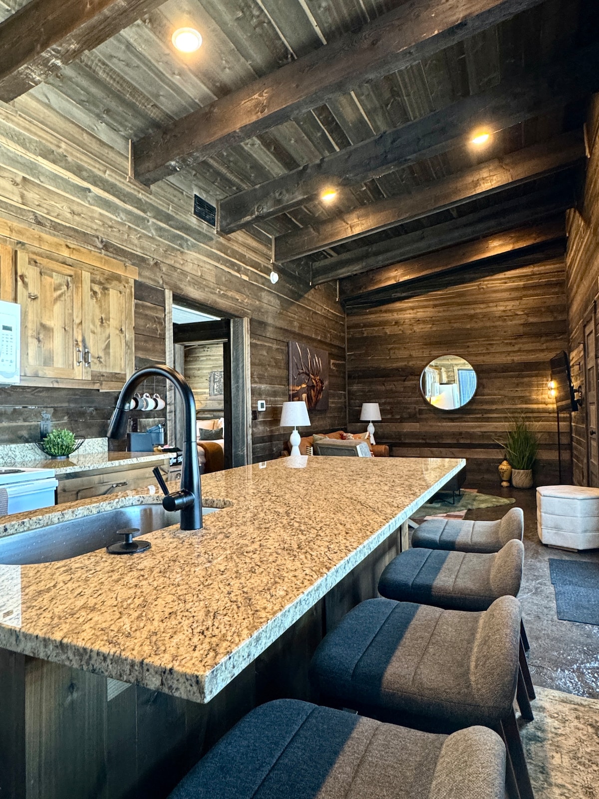Beautiful Western saloon located on a 10 acre property in Teton Valley. Guests can enjoy stunning sunsets and sunrises at this fun and unique accommodation. This spacious, one bedroom saloon has a plush queen bed, pull-out sofa bed, cozy fireplace, and pool table. Enjoy lounging in the saltwater hot tub, or having a fire under the stars at this mountain retreat. A creek runs through the property, and there are multiple outdoor sitting areas where you can relax and enjoy being in nature.