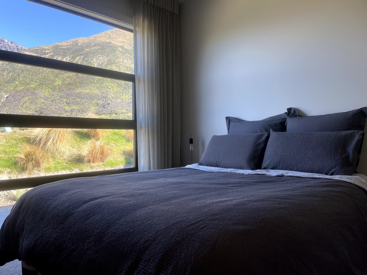 - Lenyűgöző kilátás a hegyekre – Privát környezet. – Teljesen önálló - Tágas, nyitott elrendezésű nappali és konyha - Vadon élő madarak csiripelése. – Fatüzelésű pezsgőfürdő exkluzív használata – további 85 dollár – Szabadtéri fürdő (vagy merülőmedence) a csillogó csillagok alatt -5 perc autóútra az 5 Mile bevásárlóközponttól – 20 perc autóval Queenstownig -150 méterre a Twin Rivers ösvénytől – 4 kerékpár és sisak - A Remarkable és a Coronet Peak sípályái - 30 percre - Mosógép, ruhaszárító és mosószer biztosítva - Utcai parkolás