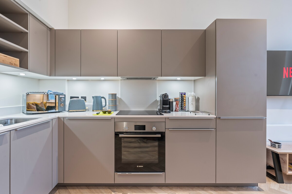 Welcome to your cosy and unique studio apartment a perfect base for business trips, weekend breaks, or longer stays. Relax in the super king bed with fresh linens, unwind on the comfortable sofa, or enjoy your favourite shows on the large wall-mounted Smart TV. The rich green accents and soft textures create a calm, boutique-style atmosphere. The compact kitchenette includes everything you need for light cooking and meal prep, making it ideal for both short and extended stays.