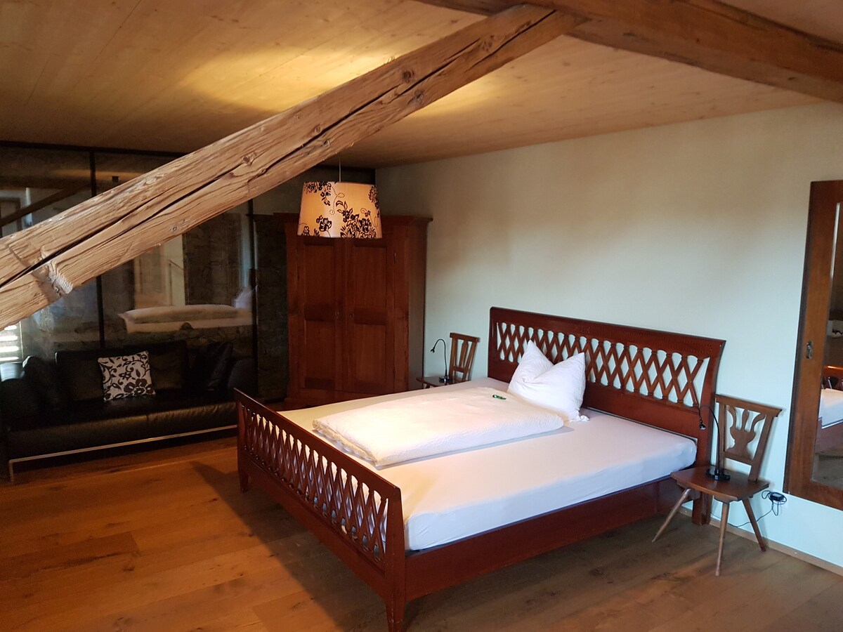 Üdvözlünk egy elbűvölő, történelmi irodaházban, amely ma stílusos vendégházként ragyog retró bájjal. Mindössze 7 szobával személyes butikház hangulatot élhetsz át kastélyra néző kilátással, napos udvarral és tágas társalgóval. 7 perc alatt az óvárosban, 5 perc alatt a tónál és körülbelül 1 óra alatt Zürichben, Rigiben vagy Interlakenben vagy. Önálló bejutás és ingyenes parkolás az árban. Közös fürdőszobák. Több szoba is lefoglalható egyszerre.