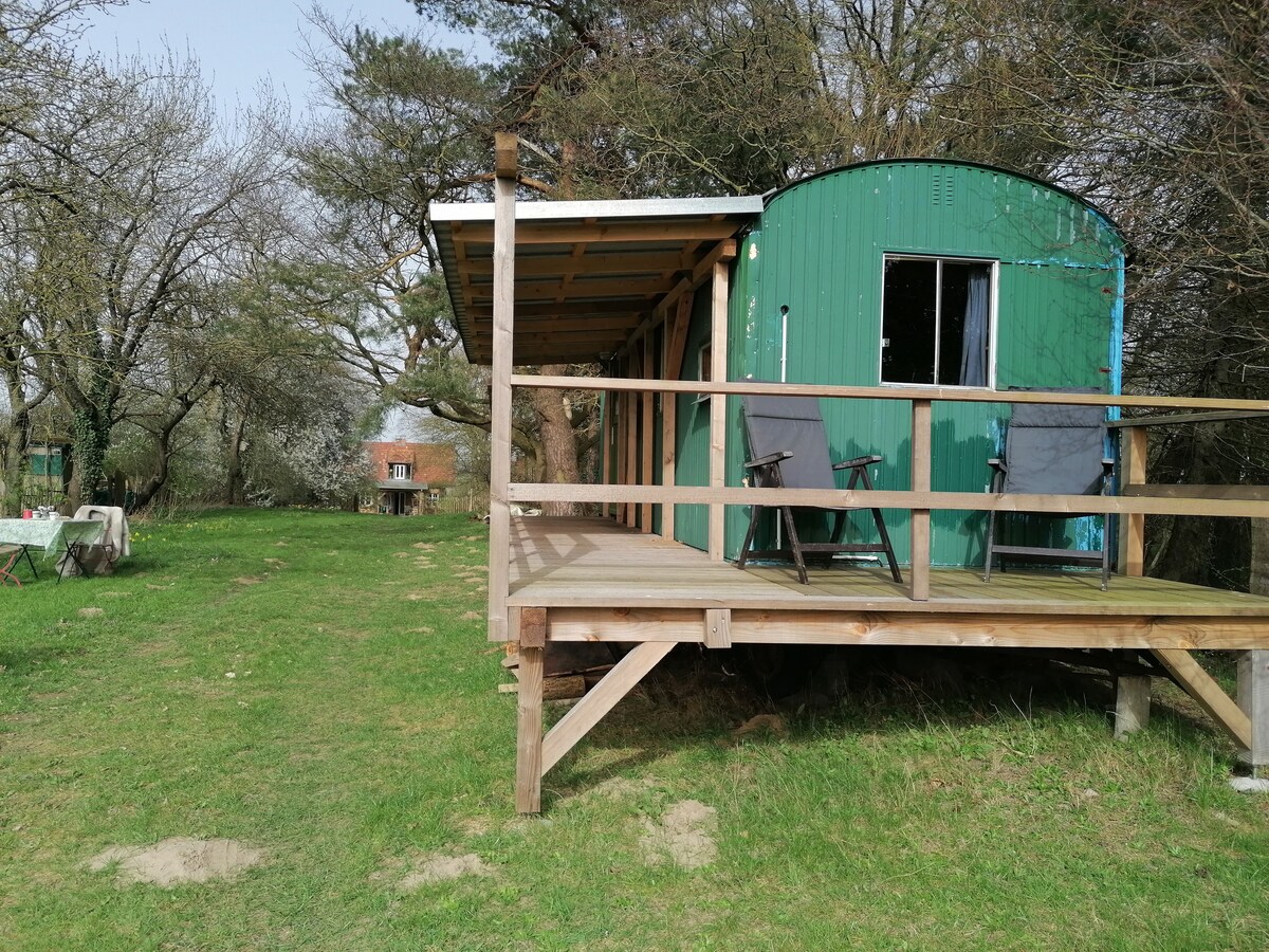 Autarker Schäferwagen mit Kamin ganzjährig nutzbar