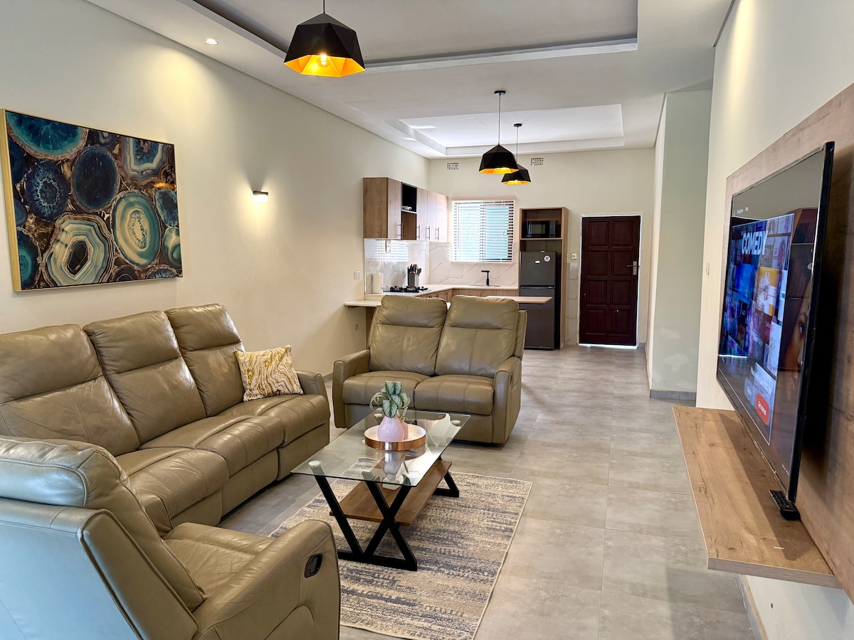 Forget your worries in this spacious and serene one-bedroom retreat. The One by Tefa offers solar power, fast Wi-Fi, a smart TV with Netflix, Prime Video, and YouTube. Enjoy a fully fitted kitchen, modern shower, a private patio perfect, a Gym and Swimming Pool for relaxing or unwinding after a long day — your calm escape in a lush, quiet neighborhood of Rockfield, Lusaka.