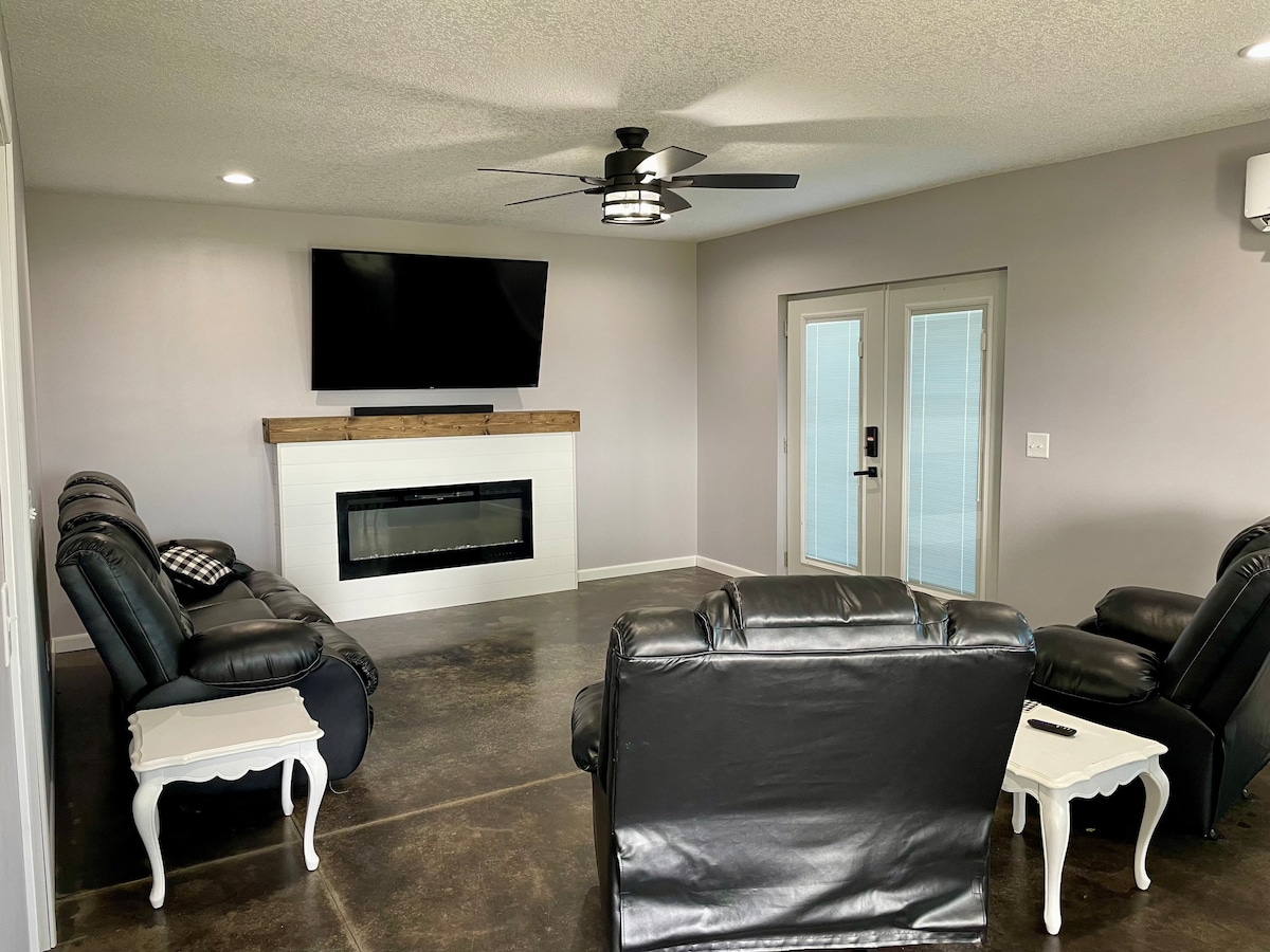 Ismerd meg az újonnan felújított, tágas, 2 ágyas, 2 fürdőszobás otthont, amely mindössze egy háztömbnyire található az ESU-tól, és közel van a belvároshoz. Ez a csodálatos ingatlan teljesen felszerelt konyhát, ingyenes parkolást, nagy sebességű wifit, valamint Disney+, MAX, HULU és ESPN-hozzáférést kínál az 58hüvelykes Roku TV-n. Élvezd a pihentető éjszakai alvást, minden hálószobában van egy kényelmes franciaágy, egy 40"-es Roku TV, és minden szoba teljes hőmérséklet-szabályozással rendelkezik. Emellett kávét és harapnivalókat is biztosítunk a kényelmed érdekében.