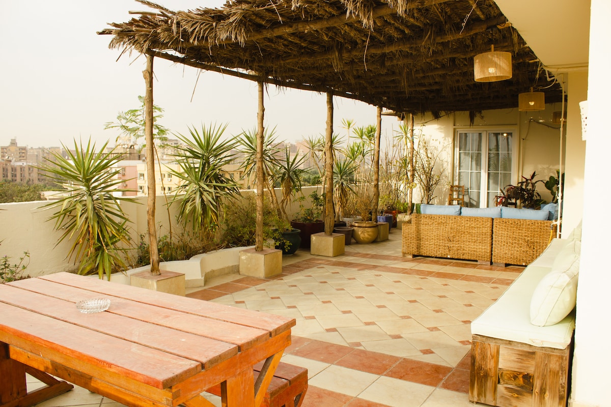 Welcome to Gardan in the Sky - Maadi, a Penthouse retreat with lush greenery and 270° skyline Views above cairo. Steps from Street 9 cafés, restaurants, and daily essentials. Enjoy central living with a private rooftop and terrace in one of Cairo's most walkable neighborhoods. The apartment features a bright living and dining area, fully equipped kitchen, Nespresso machine, 1.5 bathrooms, air conditioning, Wi-Fi, and a washing machine-ideal for both short and longer stays.