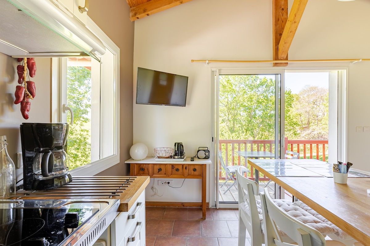 A tenger és a hegyek közelében gyere, és töltsd fel az akkumulátoraidat egy menedékben, 10 percre Biarritztól. A több mint 3 méteres gólyalábakon álló, buja kertben fákkal körülvett víkendház teljesen felszerelt, így nagy kényelmet élvezhetsz a természet szívében. A teljesen felszerelt nyári konyha a kabin alatt található. Madárdalra fogsz ébredni. OPCIÓ: a helyszínen fizetendő (hitelkártya nélkül): északi fürdő 40 € (vagy 50 € 2 fürdőköpenyért). Egyszerű, önálló reggelit tartalmaz .