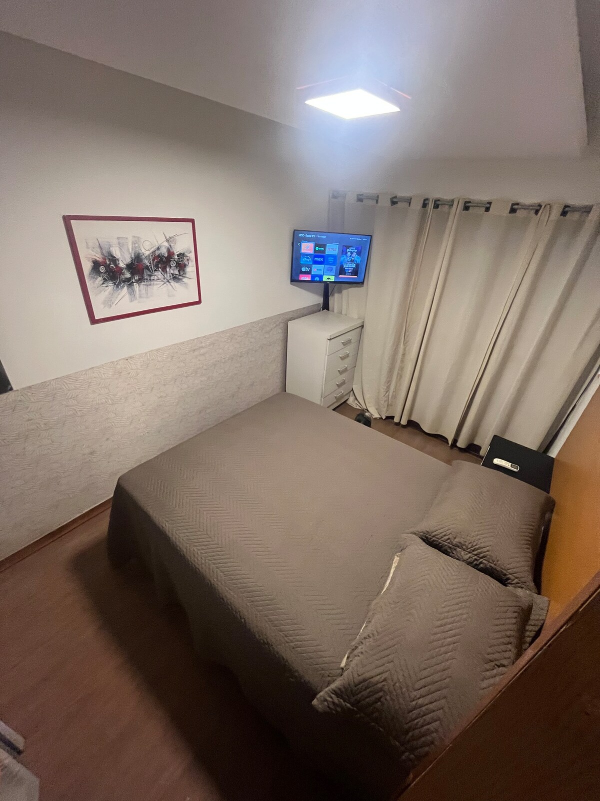 Üdvözlünk, a kétszemélyes hálószobával rendelkező házunkban kétszemélyes ágy, éjjeliszekrény, komód, fülke/szekrény, tükör, 32 hüvelykes TV és légkondicionáló található, valamint 3 ablak az utcára néző kilátással. 200 méterre vagyunk a Cruz das Almas strandtól és 370 méterre a bevásárlóparkoktól.
