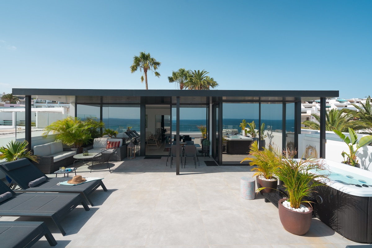 Luxury Puerto Del Carmen penthouse. Newly built, this property is ready for your next getaway. With 2 unique bedrooms and 2 bathrooms there is plenty of room for the entire family to enjoy. Bask in the beauty and take in the picturesque scene! Enjoy 180-degree unencumbered views of the Pto del Carmen harbor, Atlantic ocean and neighbour island Fuerteventura from the terrace. Featuring top-of-the-line amenities such as an outdoor jacuzzi and so much more to ensure an unforgettable experience!