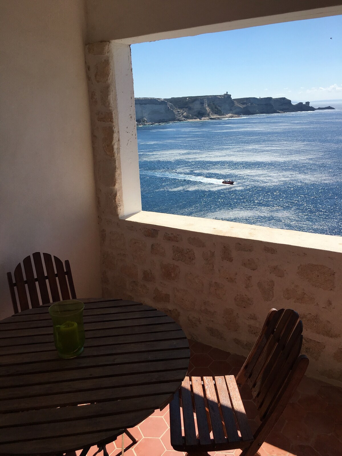 Egyszintes apartman található egy sétálóutcában a felső város Bonifacio A hálószoba a tengeren, egy franciaággyal 2, szekrény és komód, WC-vel és zuhanyzóval Egy második egyszemélyes ággyal, tároló, kis iroda , zuhanyzó WC-vel A kis tengeren, kis pótággyal Nagy terasz asztallal és székekkel, ahonnan csodálatos kilátás nyílik Szardíniára Foglalás 2 fő részére - pótdíj személyenként - ágynemű és fürdőszoba ágynemű biztosított