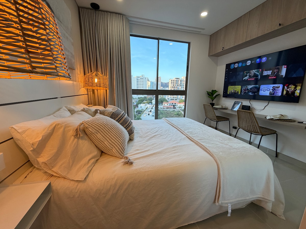 Látványos, vadonatúj, modern lakás egy 17. emeleten, tengerre néző kilátással és közvetlen hozzáféréssel a strandhoz. Kellemes hely nyaraláshoz, pihenéshez és/vagy otthoni munkavégzéshez. 10 percre a nemzetközi repülőtértől és Santa Marta történelmi központjától, közel az éttermekhez, bárokhoz, bevásárlóközpontokhoz és gyógyszertárakhoz. Kevesebb mint egy órányira a Tayrona Nemzeti Parktól, Taganga, Minca. Az apartman nagy erkéllyel rendelkezik, ahol Kolumbia legjobb naplementéjét élvezheted.