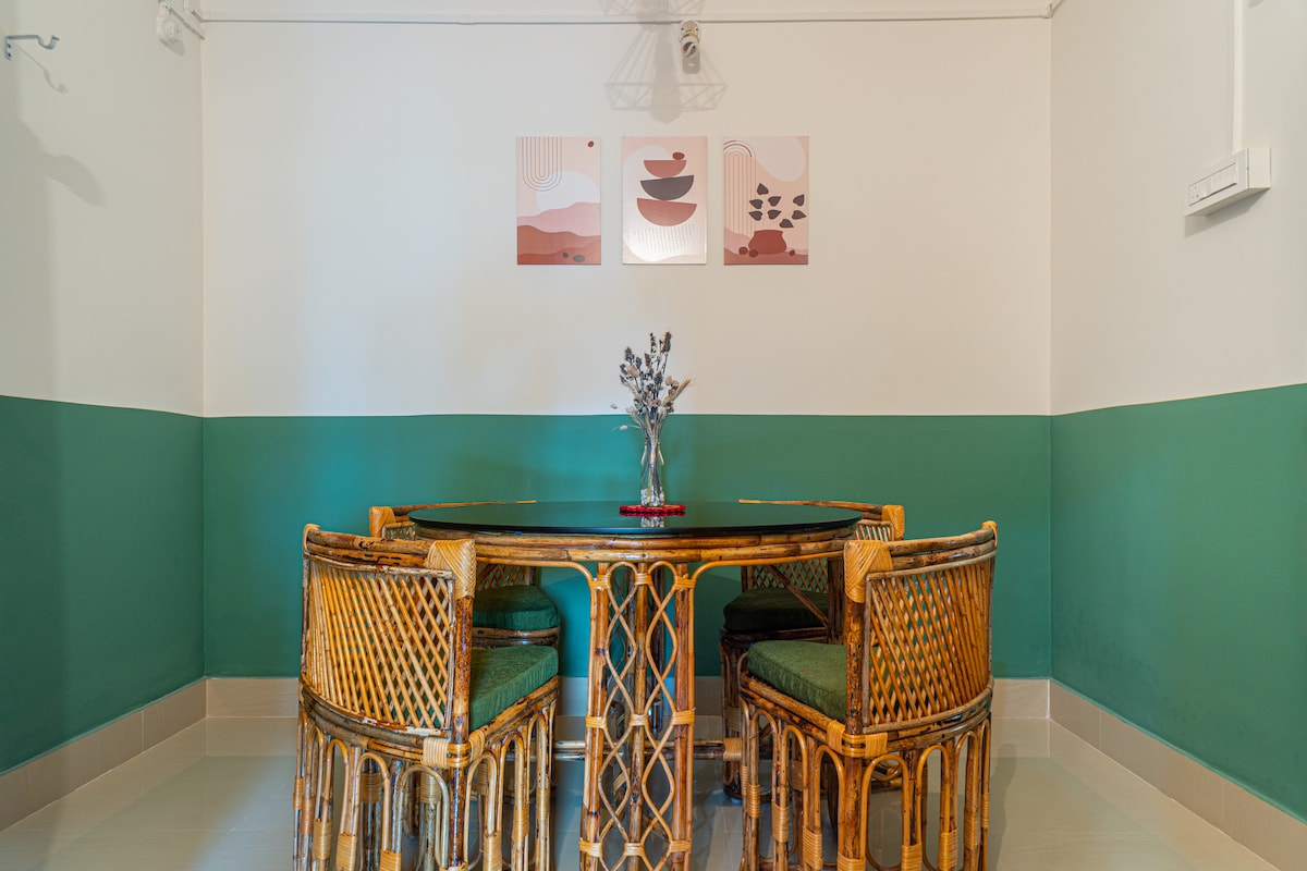 Üdvözöljük hangulatos és átgondoltan kialakított 3 szobás lakásunkban, amely tökéletes családoknak, csoportoknak vagy távolról dolgozóknak! Minden hálószobában kényelmes queen méretű ágy, mennyezeti ventilátor, szekrény és saját egyedi hangulat található 1. szoba: Szórakozószoba tévével 2. szoba: Az egyetlen szoba légkondicionált munkaterülettel és mesekönyvekkel 3. szoba: Szabadidős tér pihenéshez vagy nyújtáshoz Élvezd a funkcionális konyhát, a nagy sebességű Wi-Fi-t, az indiai és nyugati WC-vel felszerelt közös helyiséget, a külön fürdőszobát gejzírrel és az ingyenes parkolást!