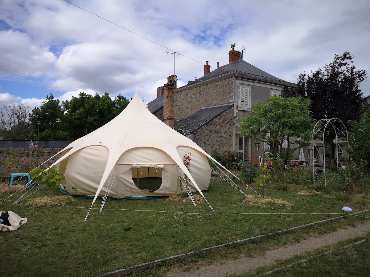 Lélegzetelállító kilátás a Loir-völgyre. Élvezd a vidék csendjét, a madárdalokat, és hagyd, hogy körülöleljen a természet... Egy sátor, igen! De valódi tömörfa ággyal, kényelmes matraccal és vidéki fürdőszobával (mosdókagyló, napenergiás zuhanyfej és száraz WC). Tökéletes egy romantikus hétvégéhez, ha el kell szakadnod a mindennapoktól, ha nyugalomra vágysz, ha visszatérnél a természethez, ha ízelítőt szeretnél kapni a vadonból...