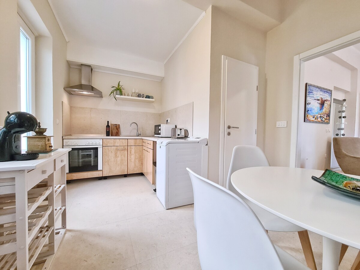 A lakás 2022-ben készült el. A 100 m²-es apartmanban található egy luxushálószoba 200 x 200 cm-es boxspring ággyal és saját fürdőszobával, egy teljesen felszerelt konyha, egy nagy nappali és egy extra WC. A nagy, fedett erkélyről nagyszerű kilátás nyílik a kikötőre és az óvárosra, emellett pezsgőfürdő, napozóágyak és zuhanyzó is rendelkezésre áll. Az épület előtt fedett parkoló található. A kikötőtől 500 méterre, a fő strandtól pedig 800 méterre található. Bízunk benne, hogy hamarosan vendégül láthatunk. Tina