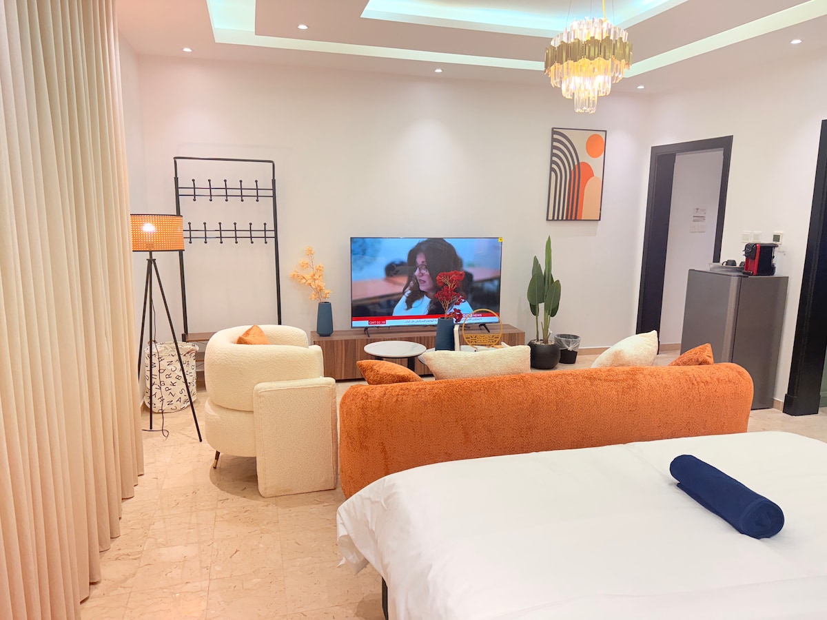 Welcome to our cozy private studio, designed for your comfort. 🚪Enjoy the convenience of Self Check-in with a smart keypad. Enjoy 5G wifi and a 75-inch TV with Netflix, Shahid, and YouTube Premium The bathroom is stocked with essentials like towels, soap, shampoo, and body wash for your convenience. Just a minute away, you'll find everything you need such as a mini-market, laundry service, barber shop, and restaurant.