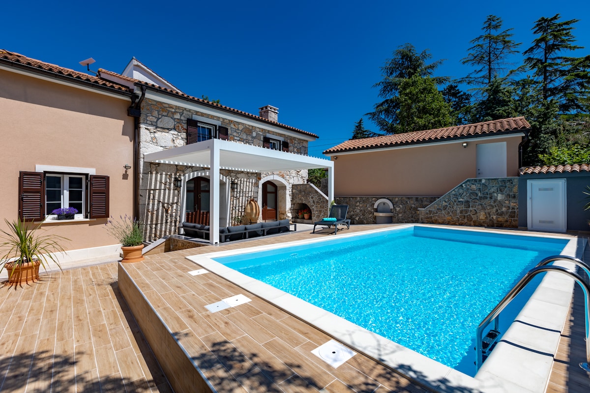 Retreat oázis! Gyönyörűen felújított kőház csendes helyen, úszómedencével és gyönyörű kilátással a tengerre és Rijeka csillogó fényeire éjszaka! Egy gyönyörű természettel körülvett dombon található… A medence körüli sima elektromos helyek és teraszok pihenésre invitálnak. A kert körüli kőfal garantálja a magánéletet! Ideális családok és barátok számára. Az ingatlan kutyák számára alkalmas. Távol a tömegturizmustól, de elég közel ahhoz, hogy bármikor elmerülj a színes életben!