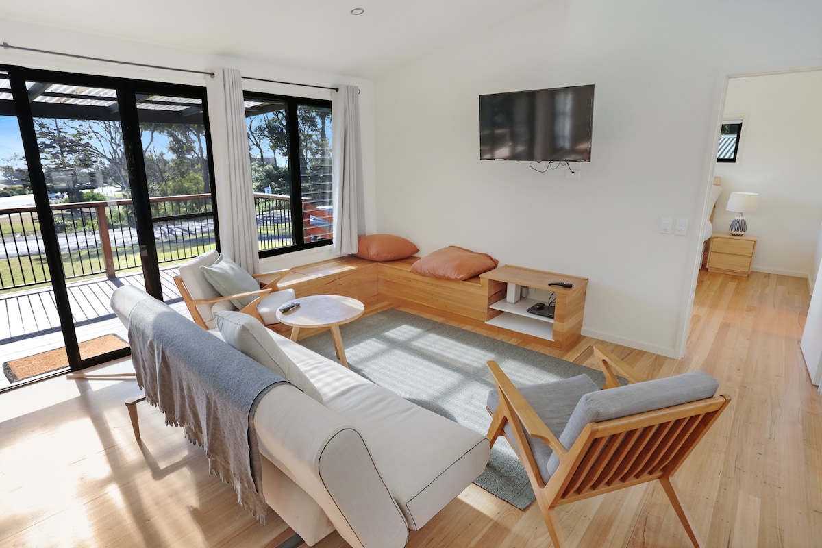 Világos, szellős, modern, önellátó stúdióapartman csendes udvarban, ahonnan lenyűgöző kilátás nyílik az óceánra, a tavakra és a Mallacoota bejáratára. Festői, 15 perces tóparti séta a kávézókhoz, galériákhoz, pékségekhez és szupermarketekhez . Teljesen felszerelt konyha, nyitott terű társalgó szomszédos hálószobával és külön modern fürdőszobával. Kültéri grillezőhely . Széles franciaágy és egyszemélyes ágy az alvóhelyen .