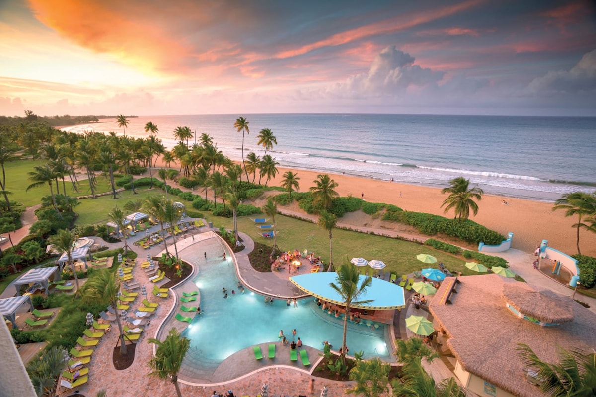 Ez a trópusi üdülőhely a zöldellő esőerdő és az aranyhomok között bújik meg mindössze 30 mérföldre a történelmi Old San Juan-tól. Tökéletes búvóhely a kikapcsolódáshoz — legyen szó egy kör golfról, egy finom gyógyfürdőről, egy forró kaszinóról vagy egy helyről, amely a parton hever egy frissítő hajóital társaságában. Amikor a zene hív, menj a saját trópusi oázisodba. Rendelj egy italt az 5 o'Clock Somewhere bárból, hogy sós margaritát vagy lágert kortyolgathass a medence mellett.