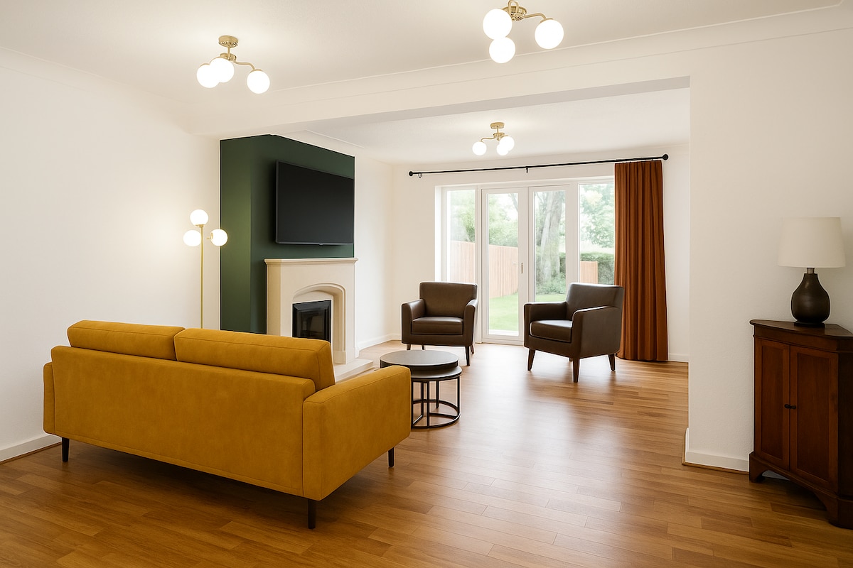Stylish 5-Bedroom Didsbury Retreat! • Prime Location: 5-minute walk to Metrolink, bars, and restaurants. • Private Parking: For up to 3 vehicles. • Open-Plan Kitchen: Fully equipped, ideal for family meals and gatherings. • Cozy Lounge: Includes sofa beds for extra guests. • Beautiful Bedrooms: 5 comfortable rooms. • Two Bathrooms: Spacious and modern. • Outdoor Space: Relaxing garden. • Accessibility-Friendly: Ground-floor bedrooms and bathroom for guests who can’t climb stairs.