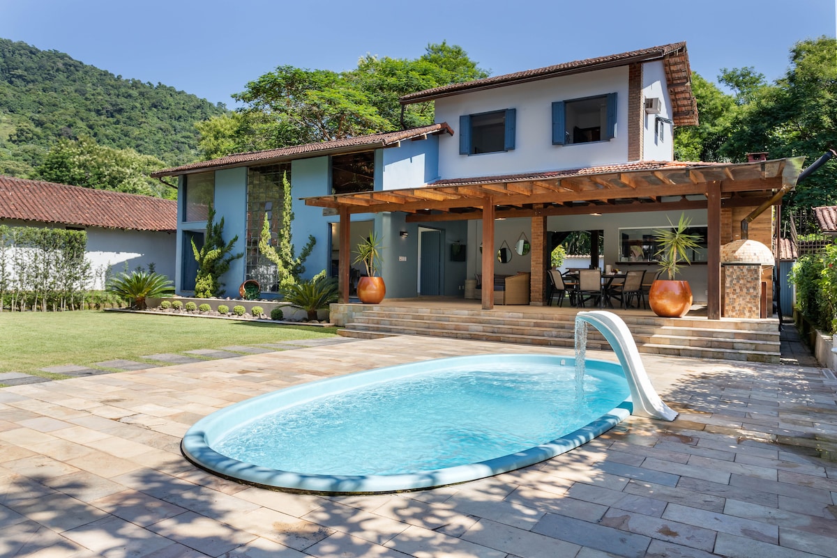 GYÖNYÖRŰ KŐHÁZ 9 fő részére, Mangaratibában, egy elzárt közösségben (társasház Guity). Saját vízesés fedett grillezővel a szomszédban és egy hely a tábortűznek. Teljes kilátás nyílik a tengerre, és 50 méterre van a nyugodt vizű strandtól, amely kizárólag a társasházhoz tartozik, ideális gyermekek és idősek számára, valamint olyan sportokhoz, mint az úszás, az álló evezős és a kajakozás*. A házban 3 légkondicionált hálószoba, 3 fürdőszoba, egy nagy nappali és egy erkély található. Szupergyors internet: 500 MG *kiadó hely