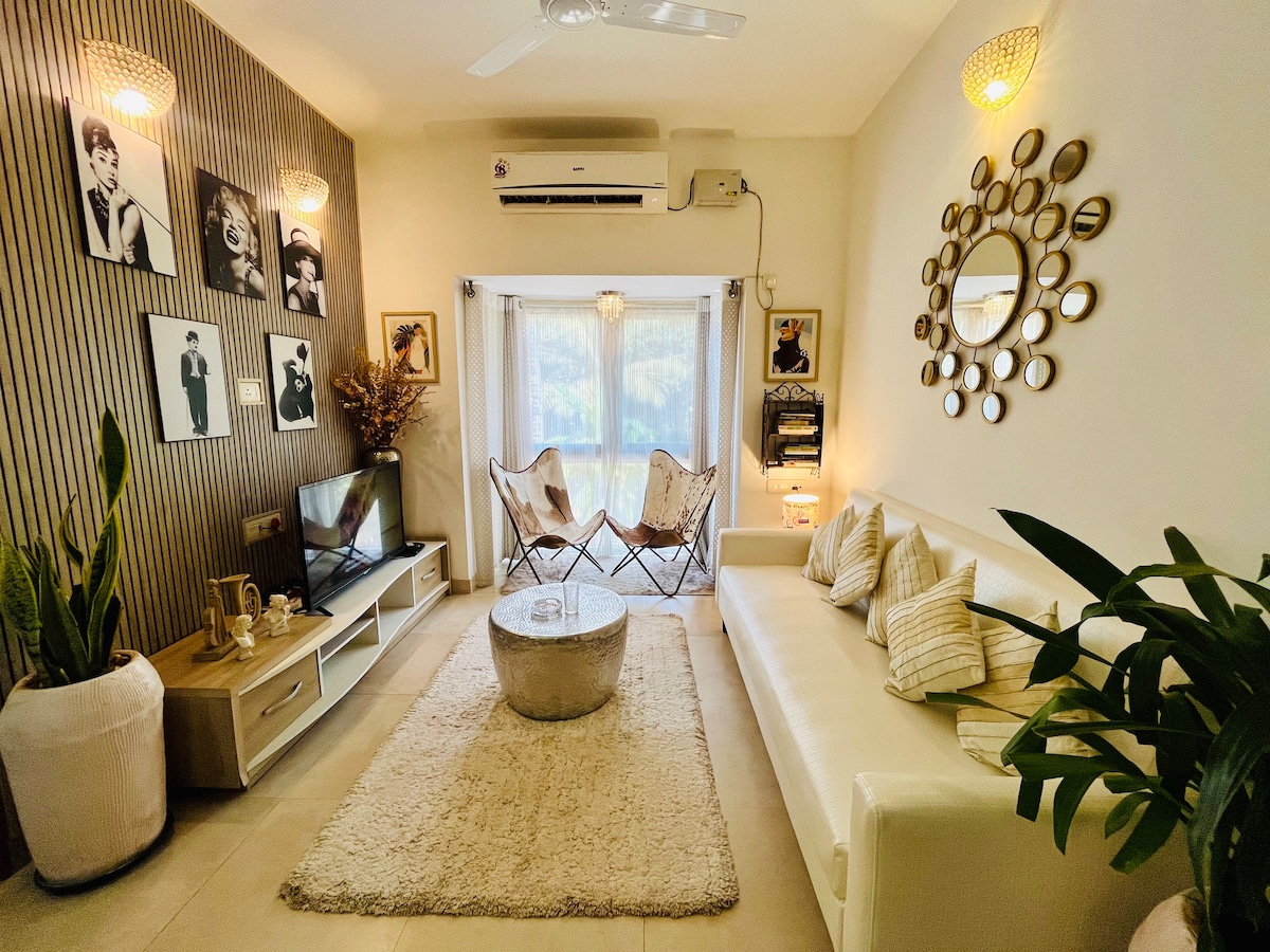Modern bohó lakás | Percekre Észak-Goa strandjaitól. Hangulatos, teljesen felszerelt, egy hálószobás, konyhás lakás a földszinten, tökéletes pároknak, barátoknak vagy kis családoknak. Kiemelt témák: – Stílusos, bohó belső terek meleg hangulattal - Légkondicionáló a hálószobában és a nappaliban a kényelem érdekében – Okostévé + nagy sebességű wifi - Felszerelt konyha RO vízzel, főzőlappal, hűtőszekrénnyel és mosógéppel - Közös úszómedence (9:00–18:00 | fürdőruha kötelező – Helyszíni edzőterem napi 200 INR/fő áron - Nonstop biztonság - Ingyenes parkolás