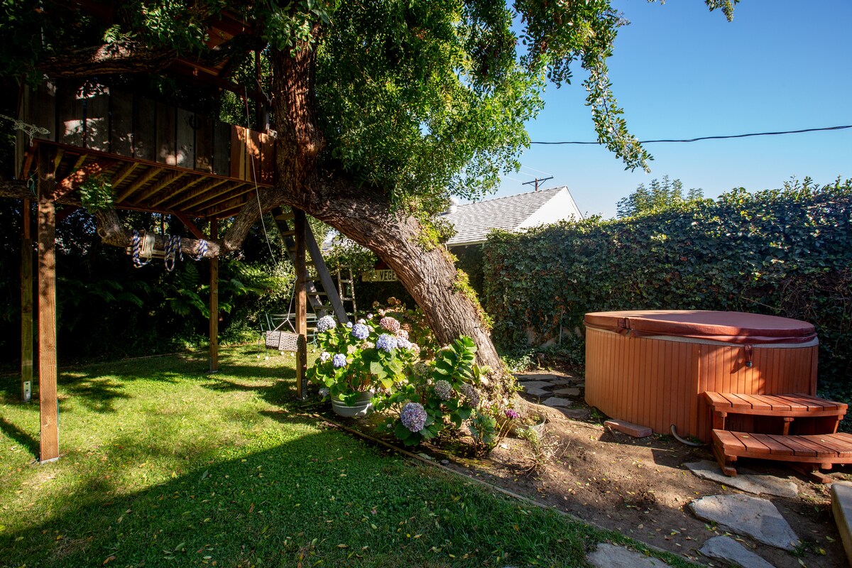 A külön bejárat egy fényűző, önálló, modern kisházba vezet, amely egy eldugott, falakkal körülvett közös kertben található. A tolóüveg ajtók mögül kilátás nyílik a liliomtóra és a kolibrikra. A fák árnyékában elhelyezkedő hálószoba parafa padlója csendes kényelmet biztosít, és fa tolóajtóval rendelkezik. A fürdőszobában zuhanyzó van, padlótól a mennyezetig érő matt ablakokkal, és van egy saját hátsó terasz is. Ez a kortárs, modern lakosztály élénk színekkel és műalkotásokkal van díszítve mindenhol. HEPA LÉGSZŰRÉS 24 ÓRÁN ÁT.