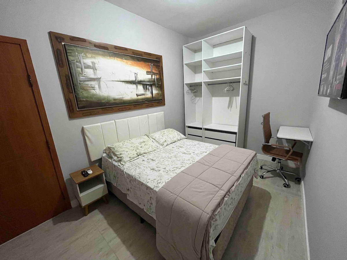 Apartamento excelente para casal com cama queen size e possibilidade de ate 4 pessoas com o sofá cama localizado na sala. Dois banheiros completos com chuveiro elétrico e ar condicionado em todos os ambientes. Garagem para um veículo. Cozinha com geladeira duplex, fogão a gás com forno e filtro duplo de água. Smart Tv de última geração 4K na sala e quarto.Internet de fibra ótica de alta velocidade, espaço para home office no andar superior(para maior conforto e produtividade). Lava e seca roupas