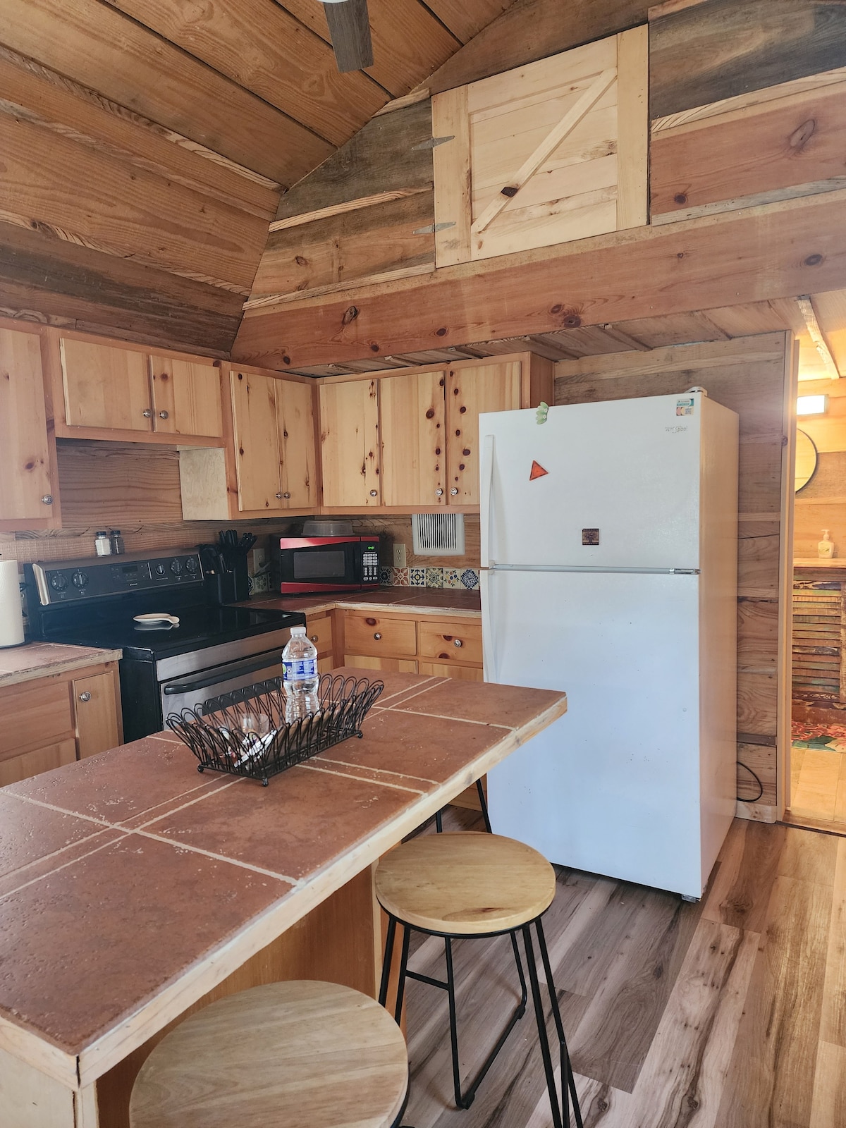 True tiny living at it's best! Rustic, quaint and full of charm. The space offers a small covered front porch and upon entering you'll find yourself in a very inviting atmosphere. A sitting area with a smart TV is available. 2 full size beds, 1 doubles as a couch, the other is in the above loft. Platform sitting area off of loft bedroom. The small kitchen offers everything you need for your stay. Bathroom features a tub/shower combo. There is an outdoor dining area with grill & firepit.