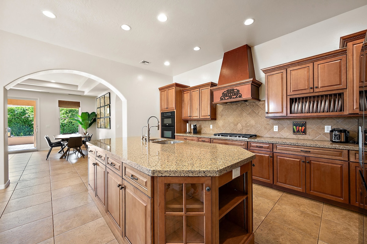 Üdv a Hidden Hacienda Scottsdale-ben! Szórakoztató, szokatlan szálláshely cowboyos dekorációval, medencével, gyógyfürdél, karaokéval és játékokkal – tökéletes lánybúcsúkhoz, családoknak vagy golfkirándulásokhoz. 10 fő kényelmes ágyban aludhat, okostévék, biliárdasztal és teljesen felszerelt konyha. Pihenj a lengő pálmafák alatt, gyakorold az ütésedet a minigolfpályán, vagy lazíts a saját hátsó udvarod oázisában, ahol hangulatos tűzrakóhely és kültéri tévé vár rád. Pár percre a Kierland Commons, a legjobb golfpályák, a tavaszi edzés és sok minden más!