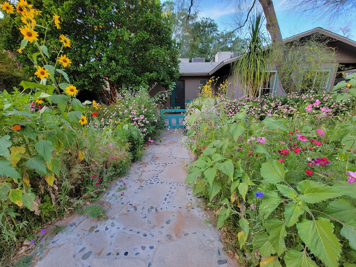 Phoenix, Arizona at it's best. The home is nestled in nature and filled with simple joys . Comfy outdoor seating under orange trees, access to airport, hiking, or downtown in 10 minutes due to the fantasic location. Yet, feels like you are in an old AZ orange grove. That is because it is! This home is located in the historic district of Phoenix Homesteads, the oldest residential neighborhood build during the New Deal as a farming community. House has full kitchen, bath, bedroom, and yard.