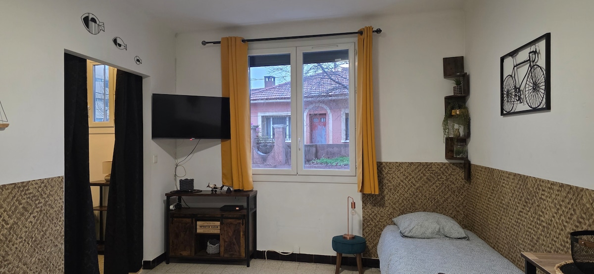 23m2-es függőség . Ideális pároknak (+gyermek és/vagy BB ), franciaággyal és kérésre gyermek- és/vagy babaággyal. Nemdohányzó. 2 terasz (1 kert/grillező + 1 asztallal borított). A kunyhó használatának lehetősége kérésre (elektromos árammal). Csendes környék a lakóhelyen és privát parkolás. A városban (5 perc), kulturális központban, moziban, színházban, múzeumban, strandon (vitorlázás, kitesurfing), evezős klub és piac. 15 percre Marseille-től vagy Aix-en-Provence-tól és 15 percre a Blue Coast strandjaitól.