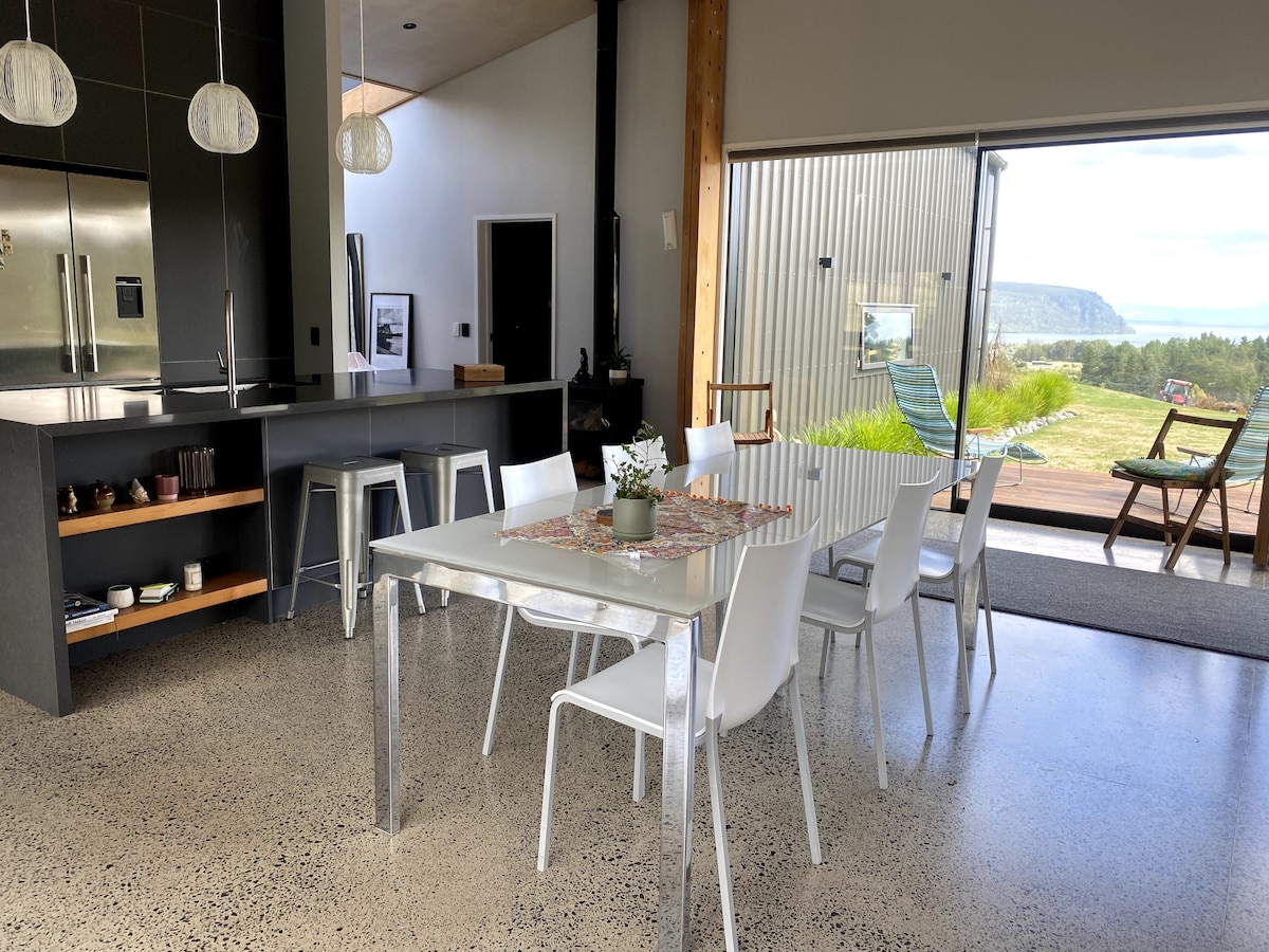 Menekülj egy békés, kortárs elvonulásra. Ez a századközepi modern ház egy dombon fekszik, ahonnan kiterjedt kilátás nyílik a Taupō-tóra és a hegyekre. Az ingatlan több hektárnyi mezőgazdasági területet foglal magában, ahol lovak élnek. Pihenj a nyitott terű lakásban , a kertben és az udvaron. Sétálj vagy biciklizz a Whangamata-patak mentén a Kinloch golfpályáig, a tengerpartig és a tópartig. Kerékpározz a helyi hegyi kerékpárutakon 100 méterre a kaputól.
