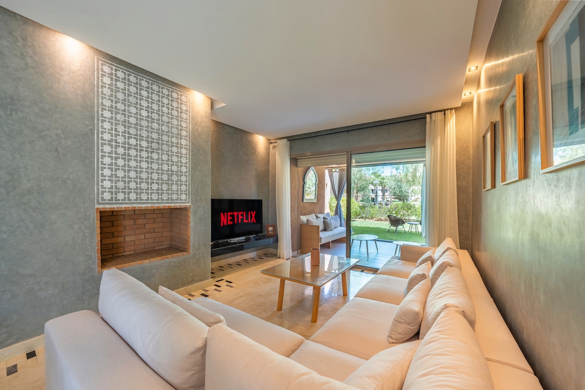 A tekintélyes Marrakech Golf City turisztikai birtok szívében található luxuslakást fedezd fel, ahonnan kivételes kilátás nyílik a golfra, a medencére és a fenséges Atlasz-hegységre. A lakást modern, bohém és beldi-chic stílusban díszítették. Teljesen felszerelt, és előkelő kényelmi szolgáltatásokat kínál A rezidencia az atlasz-hegység felé orientálódik, nagyon népszerű a csendes és biztonságos környezete és a városközponthoz való közelsége miatt.