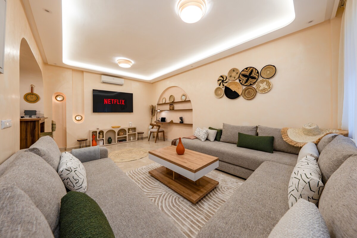 Szállj meg Marrákes szívében, a 2 hálószobás, 2 fürdőszobás lakásunkban. Élvezd a csúcsminőségű Simmons ágyneműt, a nagy sebességű wifit (száloptikás) és a modern dekorációt saját medencével. Teljesen felszerelt, teljesen felszerelt konyha, stílusos fürdőkád és olasz zuhanyzó. Egy rövid sétára a Jemaa el-Fna tértől, a Plazza tértől és a Carré Éden tértől. A medence nem fűtött. Megjegyzés: A marokkói párok nem engedélyezettek.