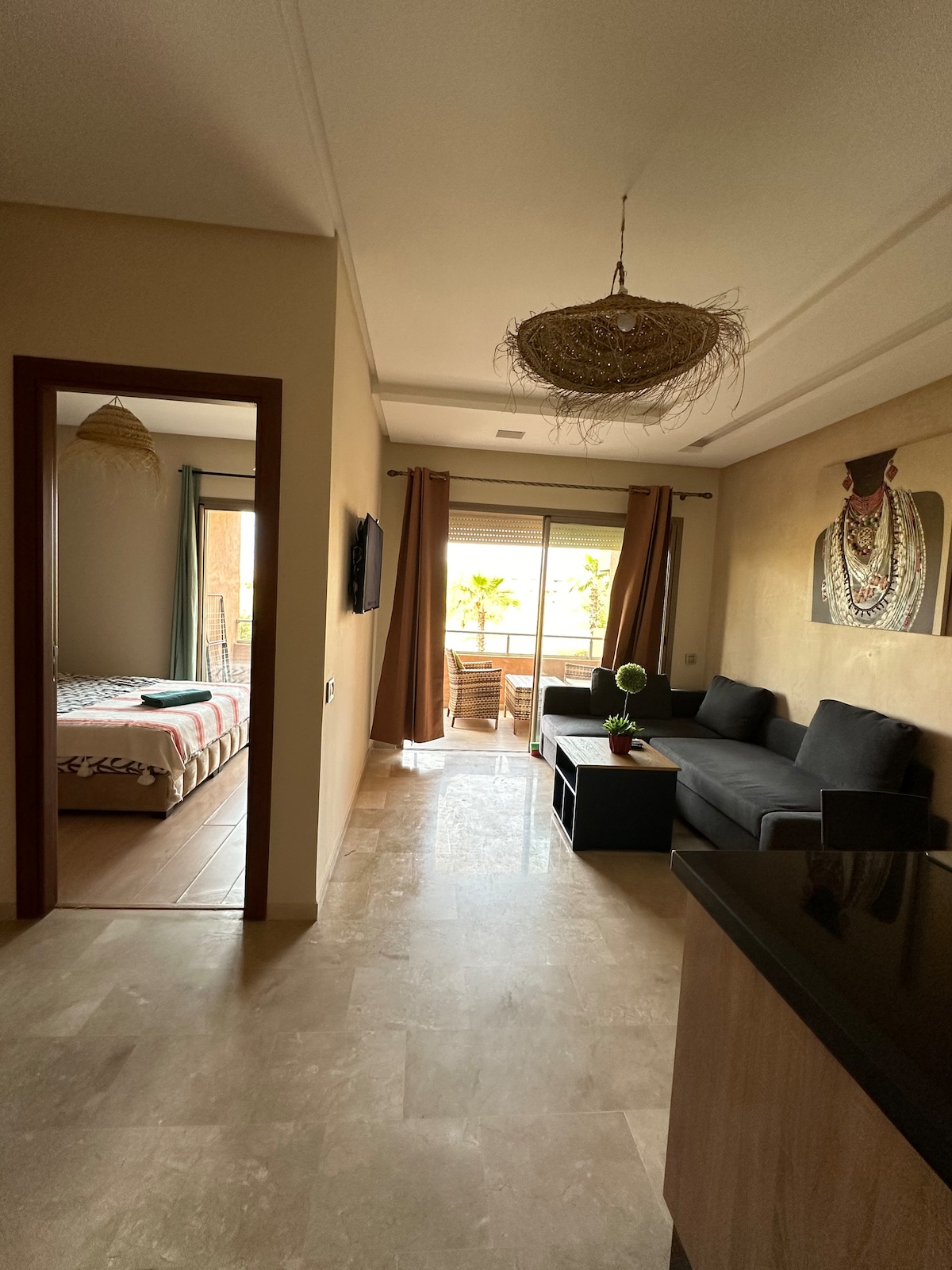 Détendez-vous dans ce logement unique et tranquille. A Prestigia Argan Golf Resort, Magnifique Appartement dans une résidence sécurisée : - Salon avec Canapé convertible, - Chambre lit double avec Tv connectée, - Deux terrasses vue piscine, - Fibre Optique 200 Mbps, idéale pour le streaming et le télétravail, - TV Smart avec IPTV et Netflix, - Cuisine équipée, - Piscine - Jardin, - Parking la piscine est ouverte à partir du mois Juin jusqu’au décembre.