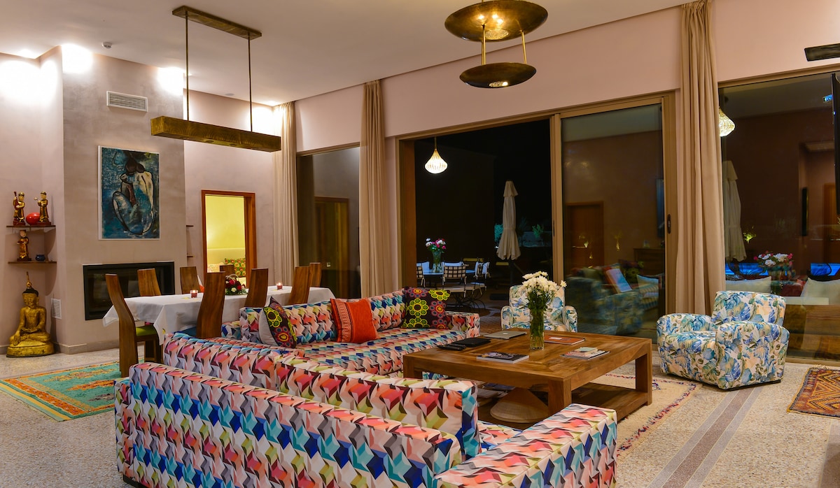 Kézzel készített pisi falakkal, marokkói stílusú villa egy békés oázisban, Marrakech külvárosában, mindössze 8,5 km-re a Medina nyüzsgésétől. Családoknak ideális választás. Gyűljetek össze az olajfák között alkonyatkor teával vagy borral, élvezzétek a magántulajdonban lévő lakomákat (marokkói vagy nemzetközi konyha), fittek teniszezni, vagy csak gyűljetek össze egy kis délutáni szórakozásra a kertben vagy a medencében. Szervezhetünk kirándulásokat, ajánlhatunk kedvenc éttermeket stb.