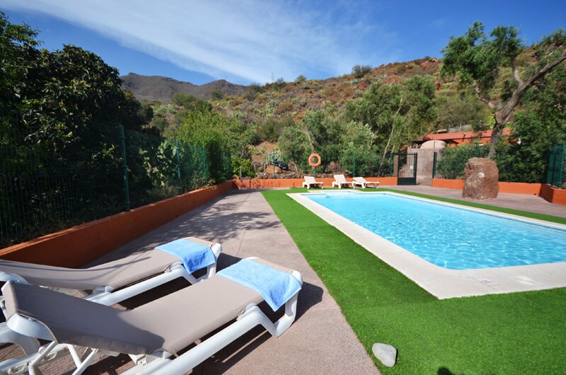 Ubicada en la ladera sur de la isla, en la caldera volcánica de Tirajana, un lugar idílico. La vista se abre 360 ° a los palmerales del valle y los picos volcánicos. Cuenta con una piscina con cascada, climatizada y tratada con sal. Está en una finca junto a otra casa de vacaciones para dos personas. Ambas casas son completamente independientes y tienen sus propios accesos y servicios, siendo el parking y la piscina las únicas áreas compartidas. Por lo tanto, la privacidad está garantizada.