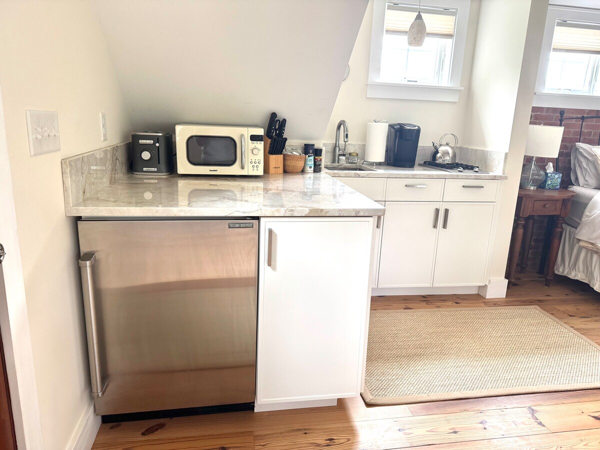 The Loft Wake up to the ocean. This top-floor penthouse sits directly on Kings Beach with unobstructed water views from every window. Cathedral ceilings, skylights, hardwood floors, a quartzite kitchen, and a jetted spa tub make this one of the North Shore’s most distinctive stays. Your own private deck. 28 minutes to Boston by commuter rail — the world is at your door, but you won’t want to leave.