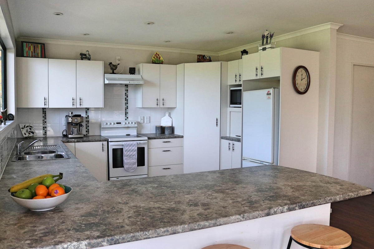 Modern telepes házikó történelmi Wairarapa területén. A házigazdák Brigid és Richard. Akár 8 fő is elfér, csináld magad reggeli. Jól felszerelt konyha. Folyamatos meleg víz. Starlink Wi-Fi (100 Mbps), gázgrill, pezsgőmedence, tűzrakóhely, trambulin, úszómedence, Smart TV, pétanque, társasjátékok, kisebb könyv-/DVD-gyűjtemény. Sétálj a 40 hektáros birtokon - őshonos és egzotikus fák, gyümölcsösök, pázsitok és paddockok. 7 perc autóval Mastertonig. Elektromosautó-töltő a helyszínen. Csendes kisház kertben.
