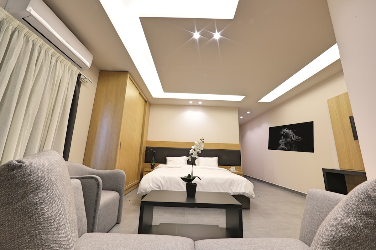 Luxus nyitott elrendezésű lakás teljesen berendezett tágas terasszal, panorámás kilátással (grillezés megengedett a teraszon). A lakásban dupla ágy vagy 2 egyszemélyes ágy található egy nyitott területen, nappalival. Teljesen felszerelt konyha evőeszközökkel, mikrohullámú sütővel, gázzal, hűtőszekrénnyel, mosókonyha a helyszínen. 10 percre van Bejrút belvárosától és 7 percre a Bellevue egészségügyi központtól. Reggeli tányér személyenként 8 dolláros felár ellenében érhető el. Macskák nem engedélyezettek.