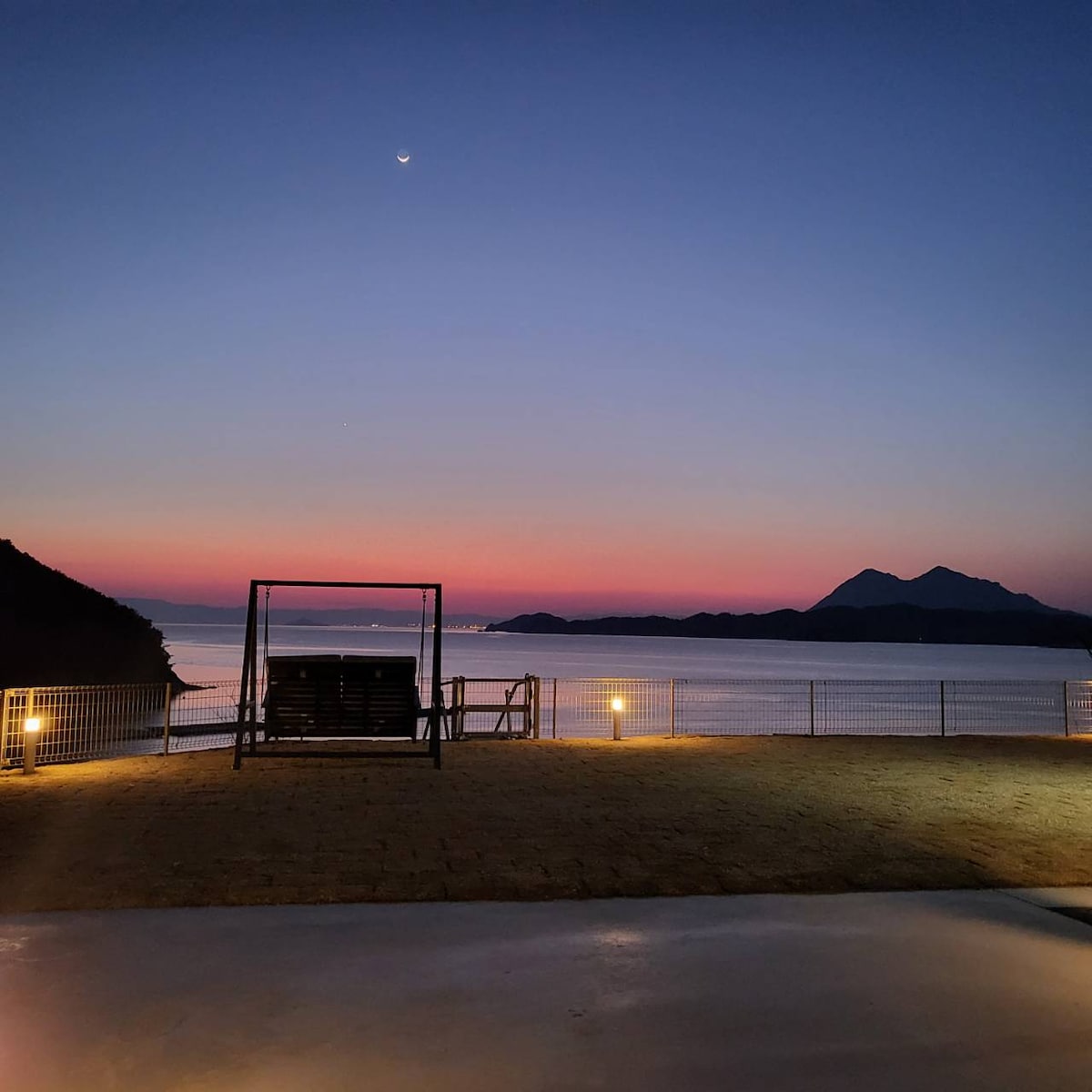 Kerti grillezés és vízparti szórakozás a Seto belső-tengeri naplementéjének élvezetével