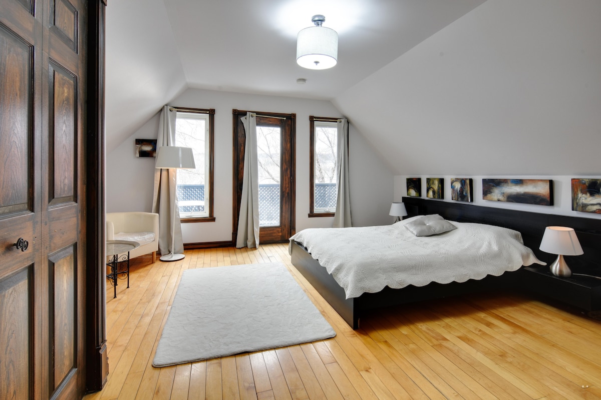 Nagy lakosztály saját bejárattal, kültéri lépcsővel, kilátással a fenséges St-Maurice folyóra. Privát gyógyfürdő a lakosztály lakóinak kizárólagos használatához és grillezéshez a lakosztály erkélyén. Mini teakonyha az autonómiádért. Ingyenes reggeliző kosár. Ingyenes hozzáférés a fűtött medencéhez, a szaunához és a kenuhoz egy folyami túrához. Új evezős deszka-bérlés. Lehetőség egy 4 fogásos vacsora a lakosztályban főzött a vendéglátó Le Palais ($$), megtudja!