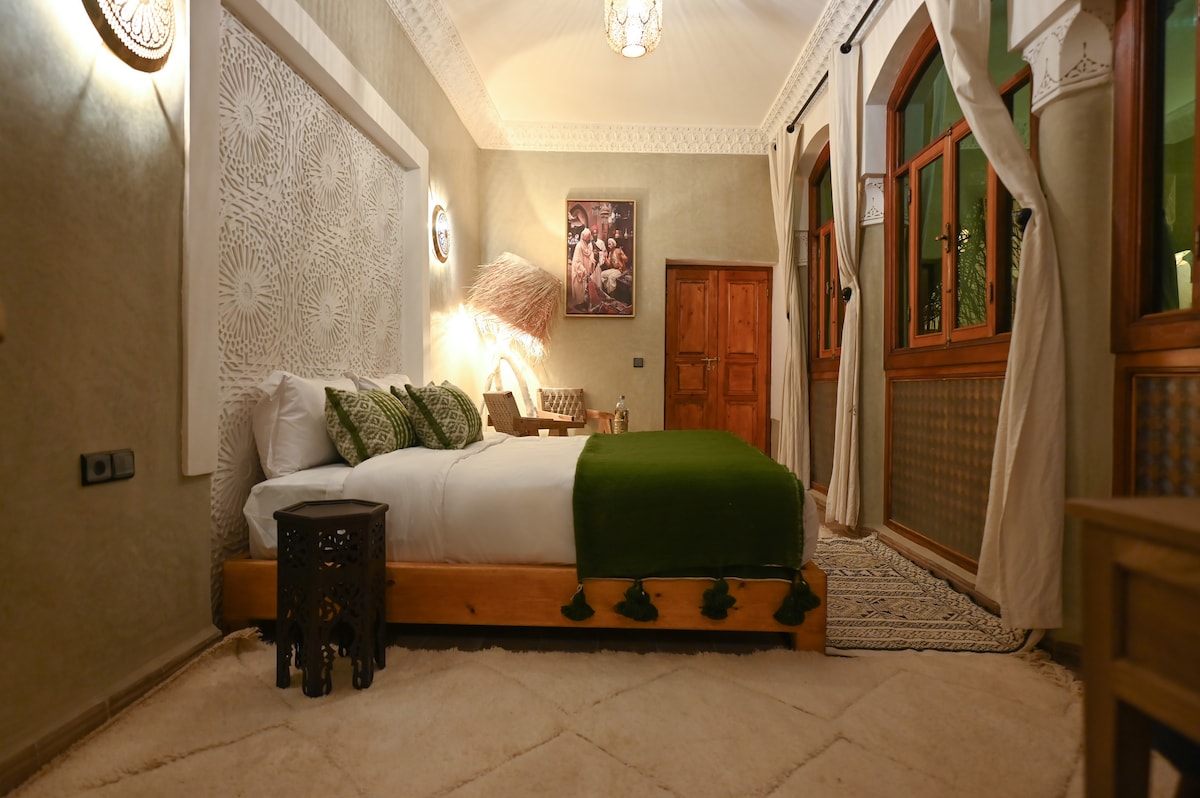 Ez a romantikus king-size ágyas szoba saját fürdőszobával a medina szívében található Riad Chekaram öt szobájának egyike (kérjük, tekintsd meg a többi szálláshelyünket az alternatív király-, két- vagy kétágyas szobák számára) Hagyományos, angolul beszélő panzió, amelyet szeretettel terveztek a helyi kézművesek használatával, tökéletes menedék vagyunk Marrakech medinájának felfedezéséhez. A Chekaramot lefoglalhatod az Airbnb-n egy külön szobával, vagy akár tíz fős csoportok számára teljes házként is lefoglalhatod, akik különleges marokkói élményre vágynak.